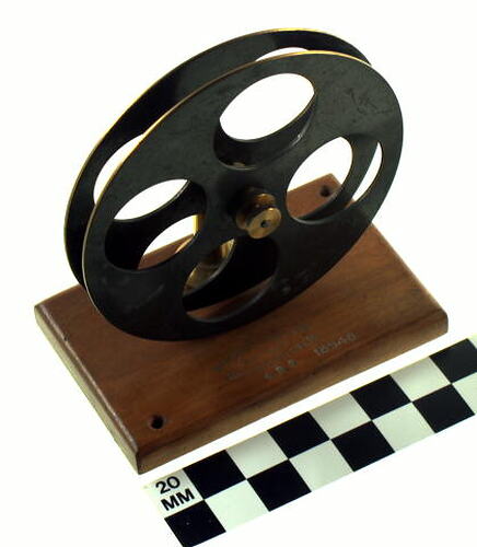 Recorder reel, made of brass, 6" diameter, for rolling on paper recording ribbon as record is made by recorder no. 18547. The reel was turned by hand of operator marked. Manufactured by Marconi's Wireless Telegraph Co. Ltd.