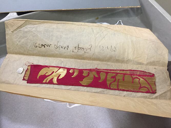 The spun glass is in a form made by Ignace Dubus-Bonnel (1794-1871), a weaver and dyer from Lille, France, who filed the first patent in1836 for making glass fabrics. He invented a process for making fine glass thread and then weaving it with silk threads on a Jacquard loom to create textiles such as hanging fabrics and church ornaments. The presence of glass within the fabric imitated the shimmering quality of silver or gold brocade, especially under candlelight. This sample is of a design of fabric believed to have been made by Dubus-Bonnel in 1839-1840.