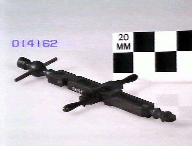 Model of a swivel and universal handle in brass and iron. Used to regulate the stroke of the borer, and for turning the boring rods and keeping them in the centre of the bore.