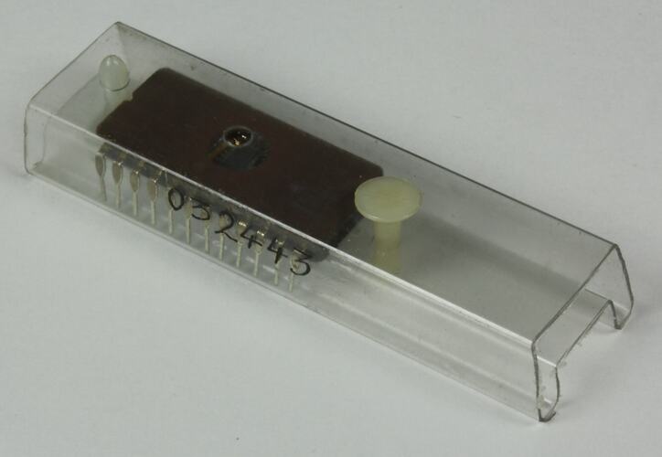 2708 EPROM. 1K x 8. UV erasable. static. introduced circa 1975. EPROM (erasable programmable read only memory). Chip requires +5, -5 and +12 volts for operation. A 26 volt pulse is required for programming.