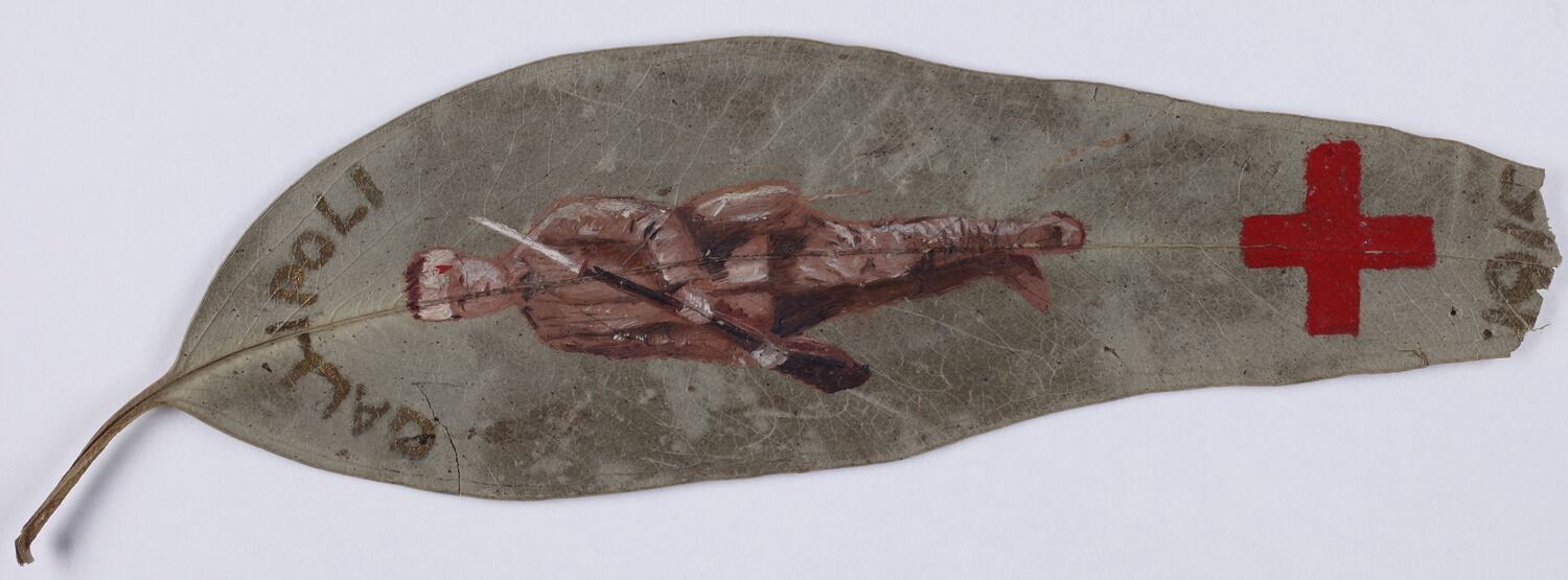 Leaf painted with image of a wounded soldier - the word Gallipoli' and '1915' in gold with a red cross.