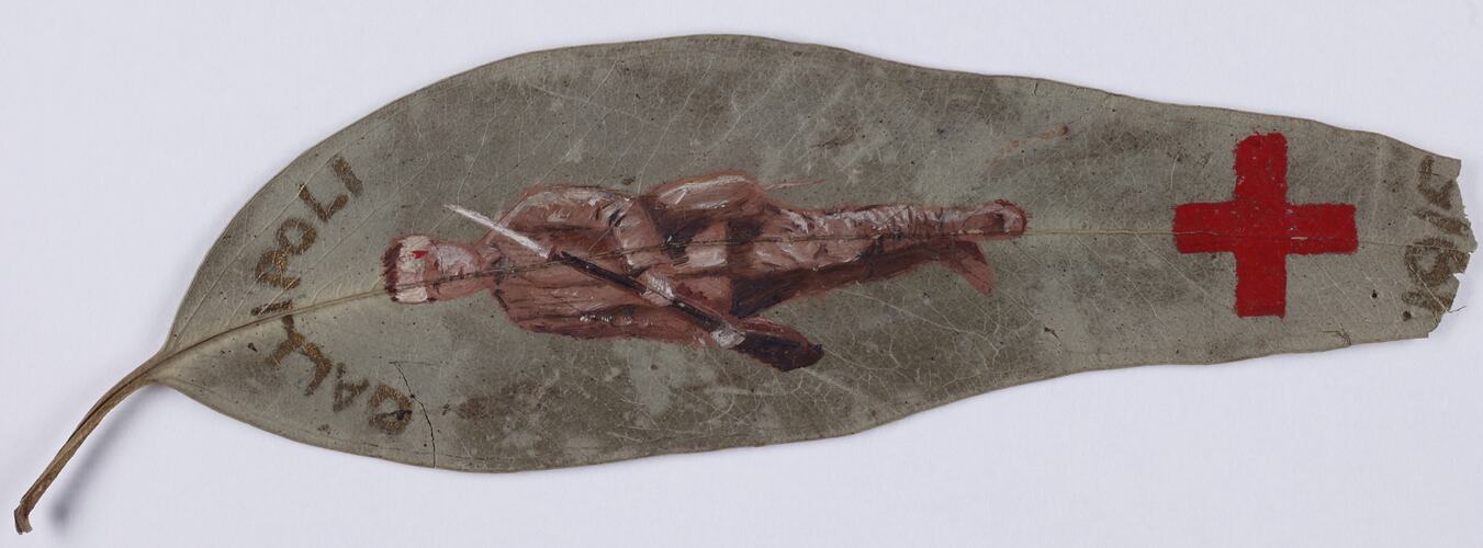 Leaf painted with image of a soldier, the word Gallipoli and the year 1915 in gold, and a red cross.
