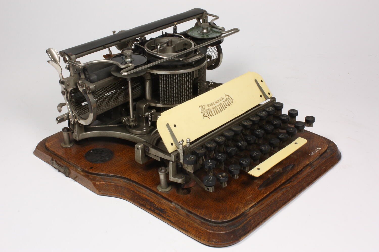 Serial number engraved on left-hand end of frame beneath carriage: '91015' On plate above and behind keyboard: 'MADE IN U.S.A. / Hammond ' On disc attached to basebosrd to left of frame beneath carriage: 'MADE IN / NEW YORK / TRADE /[Double world hemisphere image] / MARK / TYPEWRITER / U.S.A. / PATENTED' Also on disc, vertically on left side of trade mark: 'FOR ALL NATIONS' and on right side: 'AND TONGUES' Around hub of one ribbon spool: ' HAMMOND TYPEWRITER NON FILLING RIBBON / PRICE $1.00 / GUARANTEED IN EVERY PARTICULAR / [Double world hemisphere trademark] / THE HAMMOND TYPEWRITER CO. / FACTORY AND GENERAL OFFICES / 69TH TO 70TH STREETS, East River / NEW YORK, N.Y., U.S.A.' On front of wooden cover: 'Hammond'