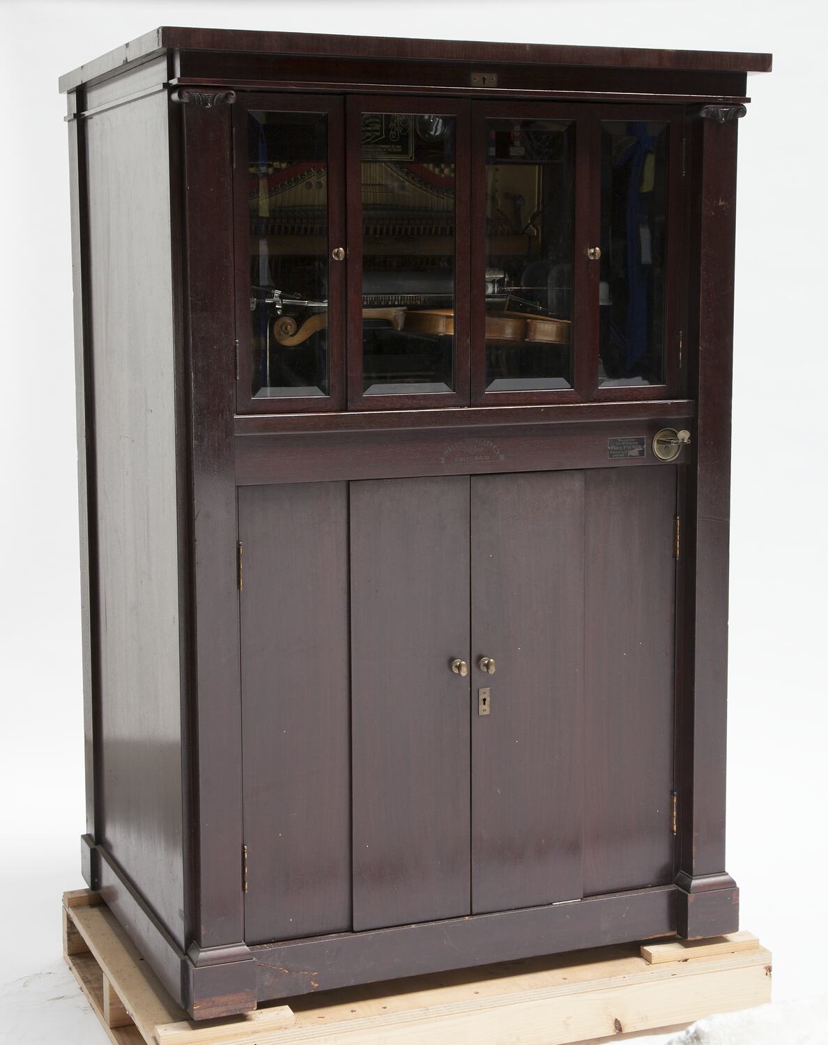 Instrument located within a wooden cabinet with glass door access to the violin in the upper half. Wood door access to paper roll device & storage in the lower half and wood door access to the piano at the rear. The violin and piano are played electro- magnetically and are under the control of perforated paper rolls.