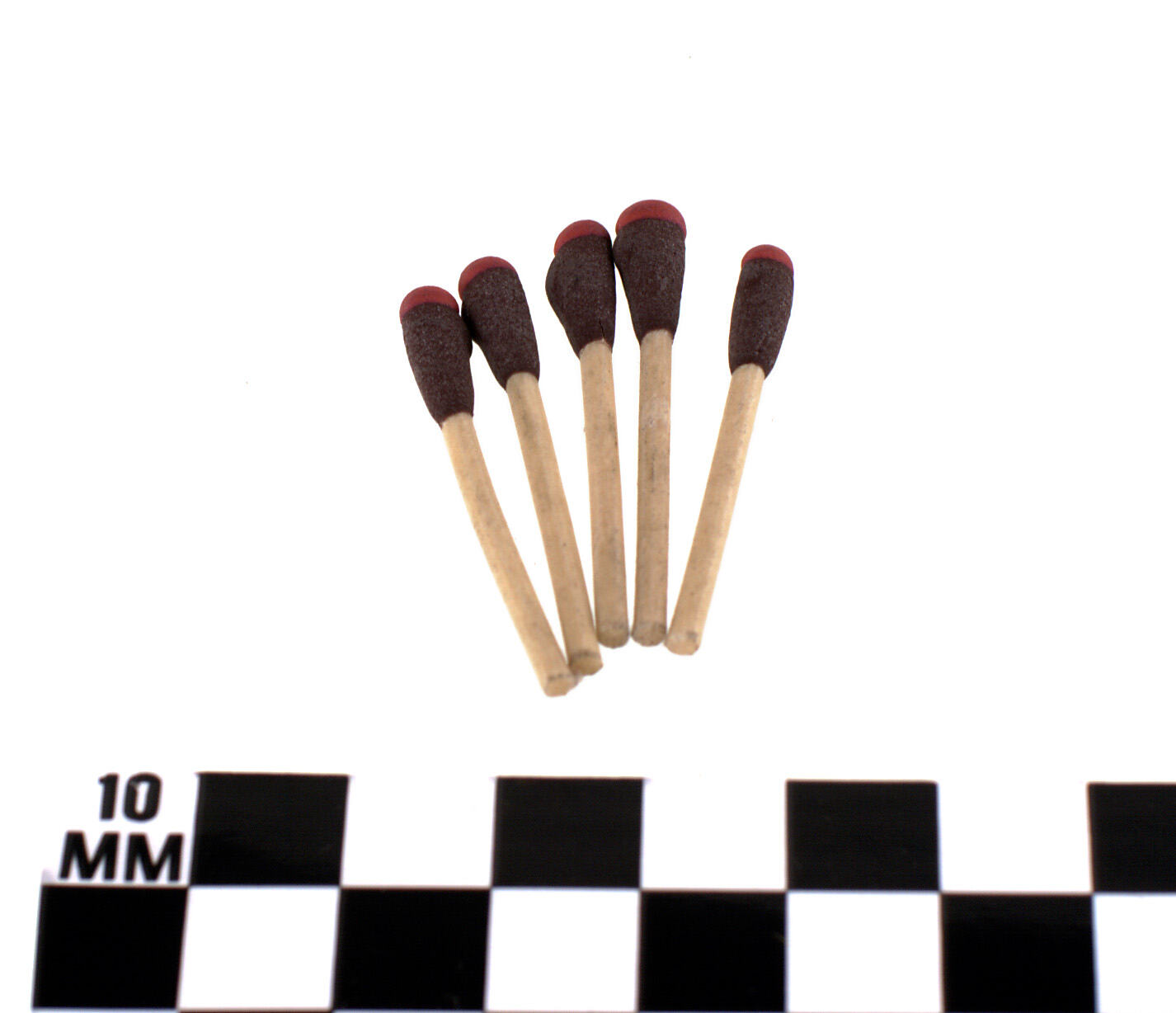 Five off-white wooden matches with red tips.