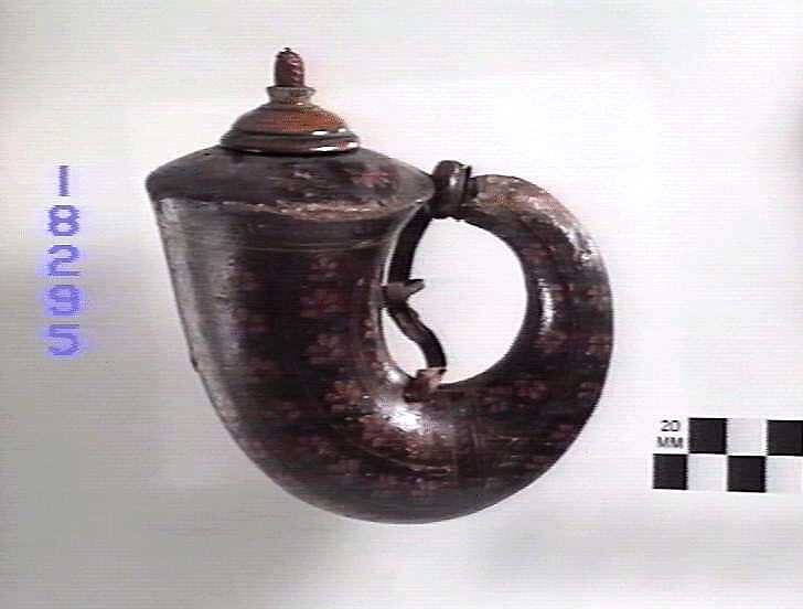 Indian powder flask, papier mache, volute shaped. Covered & ornamented with red pattern, wooden stopper.