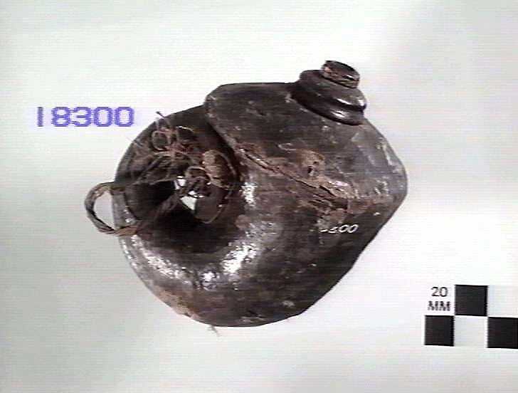 Indian powder flask, volute shaped. Wooden covered, dark brown, plain, with large wooden stopper.