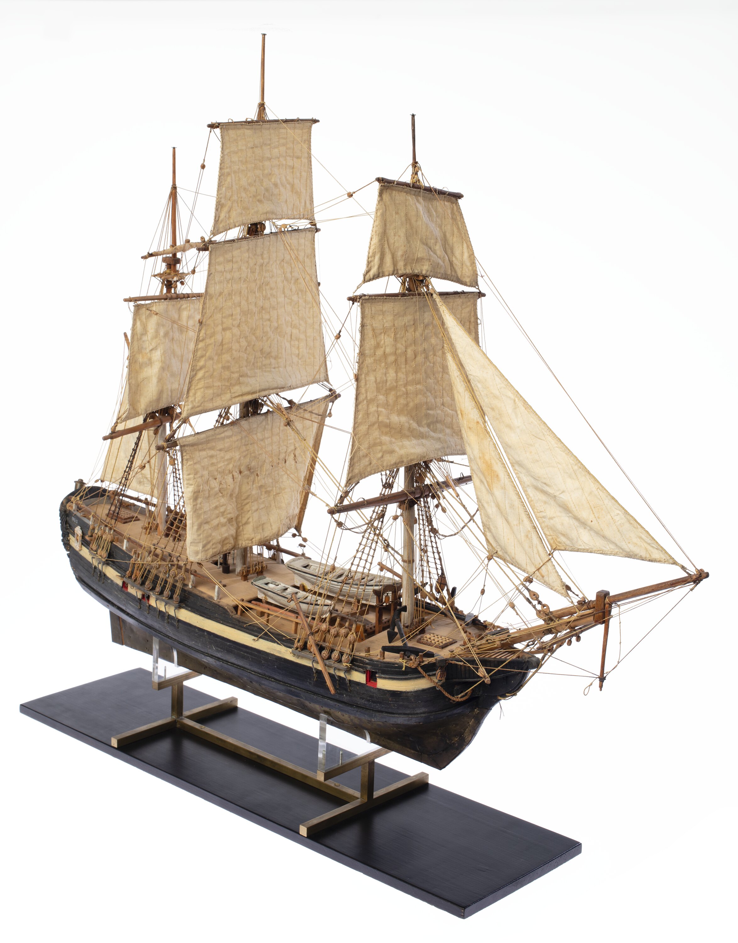 Model of HM. Bark Endeavour built by the Australian artist and author Norman Lindsay (1879-1969) who was a keen builder of ship models for much of his life. This was the first ship model built by Lindsay, who was inspired by seeing the ship models in London's Science Museum, while he was living in England. He spent most of his spare time over some three months in the ship model gallery of the Science Museum in 1910. He sketched many of the sailing ship models and gained access to the workshop where he spoke to the craftsmen and "asked one of them what he would charge me for making the bare hull of an eighteenth century model...he said he could not do it for less than 60 Pounds...it was clear that if I wanted a ship model I would have to do it myself". After consulting a number of textbooks and drawings in London, Lindsay returned to Australia and built a model of the Endeavour. It was later purchased by the National Gallery of Victoria for £100 using funds from the Felton bequest and was loaned to the Industrial & Technological Museum in 1926 and subsequently purchased. Lindsay was very keen to show that the Endeavour was a fully rigged ship not a bark which has a different rigging arrangement with fore and aft sails on the mizzen mast. He wrote an article for the 1 April 1913 edition of 'The Lone Hand' magazine explaining his theory in detail although he acknowledged it would only be of interest to 'quidnuncs' who enjoyed arcane matters. The debate about the accuracy of this model continued for many years with the journalist and later novelist George Johnston writing an article about the model in The Argus newspaper on 4 November 1933. Lindsay continued to defend his model against its many critics until his death in 1969.