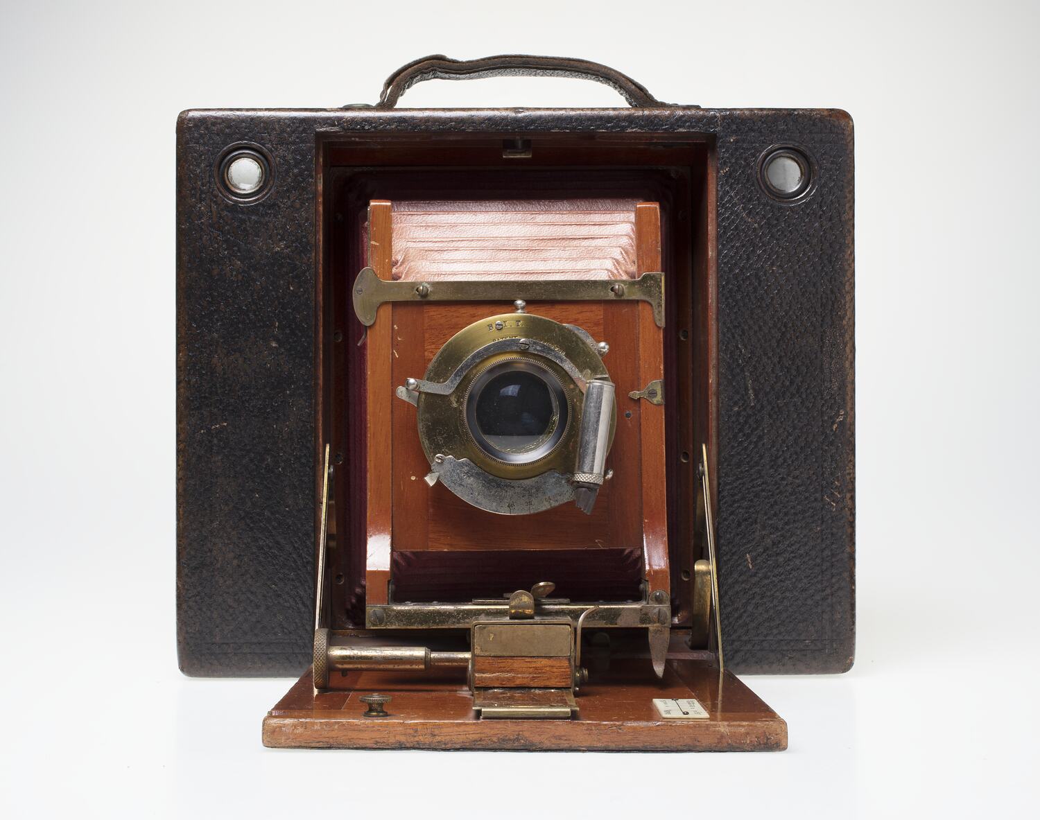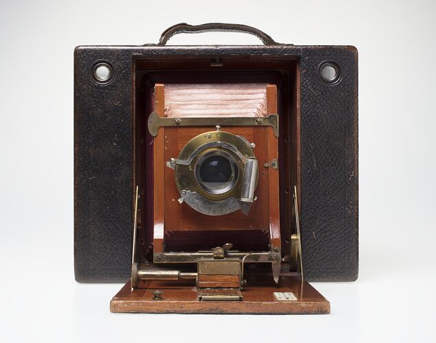 Folding camera in dark-brown leather-covered wooden body with red leather bellows. Brass and nickel plated lens mounted onto a wooden lens standard and base board. Chrome valve for pneumatic shutter fitted on face of the lens. Contains two wooden take-up spools in the interior back of camera. Leather carry handle fitted to the top plate, which bears the Eastman Kodak name.