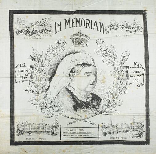 Souvenir handkerchief made in commemoration of the death of Queen Victoria, with scenes of the royal palaces and a portrait of the Queen in the centre.