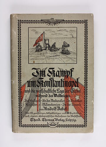 Hard-covered book, written in German, 166 pages. Cover is illustrated with drawing of three Turkish soldiers on pier, with Turkish flag in red, watching a ship on the horizon. The book title below is underlaid with Turkish and German flags. The contents of the book include extensive text in German, and black and white photographs of Turkey during the Dardanelles campaign.