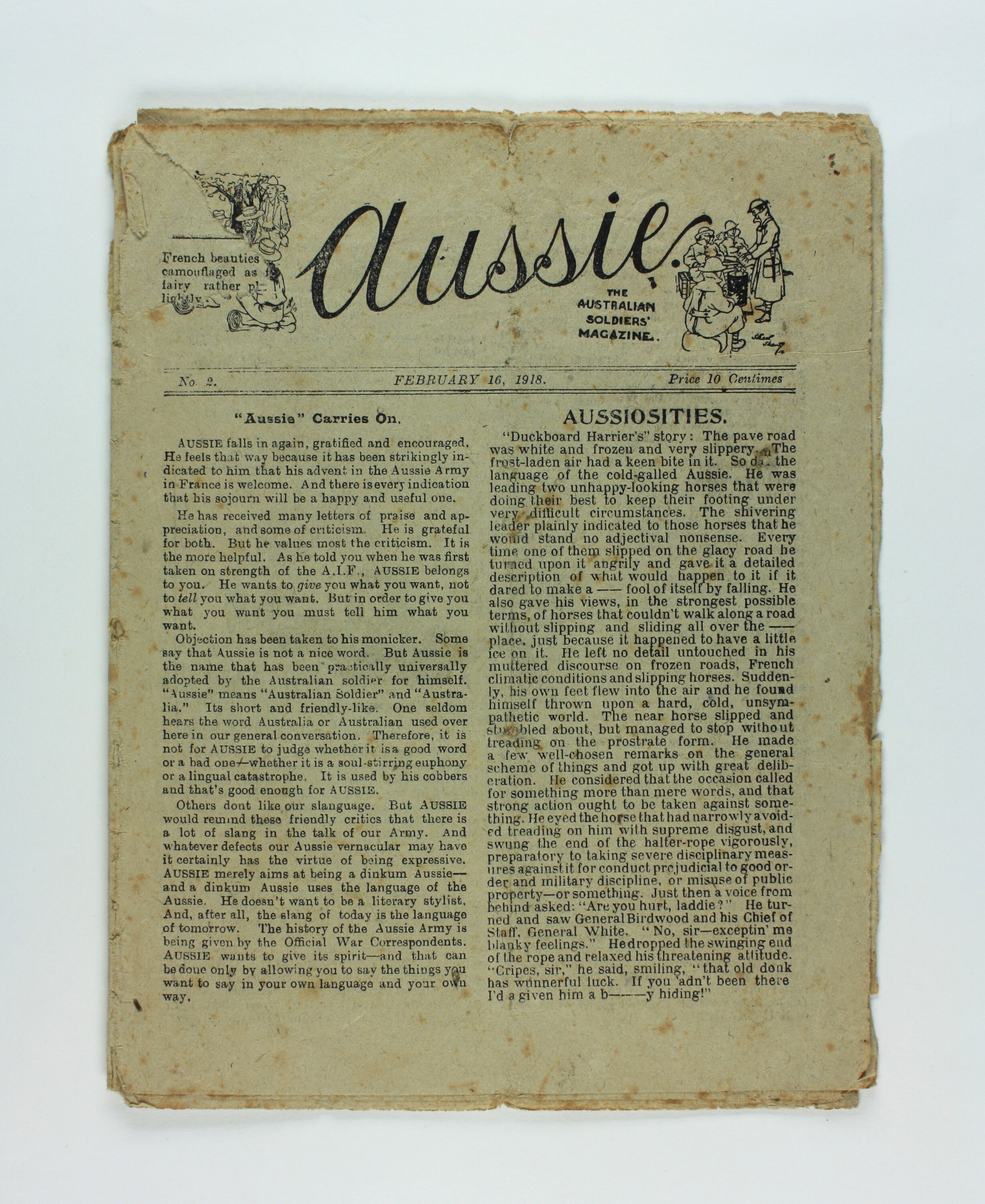 'Aussie' (1918- circa 1929) was a commercial magazine of opinion, review and entertainment. It was edited by Phillip Harris and published in France 1918 - 1919 on a small printing press that Harris brought with him to France. Initially the print run was only 10,000 copies, but soon it reached 60,000 and later 100,000. The magazine aimed to celebrate a distinctive 'Aussie' identity through language, humour and imagery. It distributed news, provided light-hearted ways of seeing the war experience and gave soldiers an outlet to express dissent or dissatisfaction. It also provided a voice for Australian authors such as Banjo Paterson, C.J. Dennis and Bernard O'Dowd. The magazine also frequently contained deeply racist and sexist imagery and references.