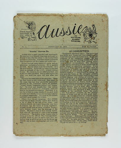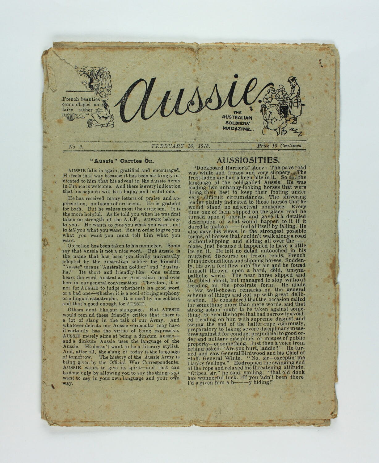 This object provides an Australian soldiers' view of the political and world climate during World War I, and also represents the bond between Australian soldiers. The magazine celebrated a distinctive 'Aussie' identity, through language, humour and their assertion of what it meant to be an Australian. It allowed news to be distributed, gave the soldiers an outlet to express any dissent or dissatisfaction, thus preventing any greater form of rebellion and promoted Australian authors like Banjo Paterson, C.J. Dennis and Bernard O'Dowd. After the war, Phillip Harris produced a monthly in Sydney from 1920 and renamed it: 'Aussie: the Cheerful Monthly'. It built a sizeable circulation and for more than a decade it published the major Australian writers and cartoonists of the day. It set out to sustain the digger culture and defend the rights of the veterans, while also embracing the re-adjustment of returned soldiers into civilian life.
