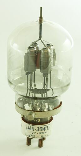 Cylindrical glass bulb with a large 4 pin ceramic base, a metal ring around the bottom of the bulb carrying two grid connections and an anode pin at the top.