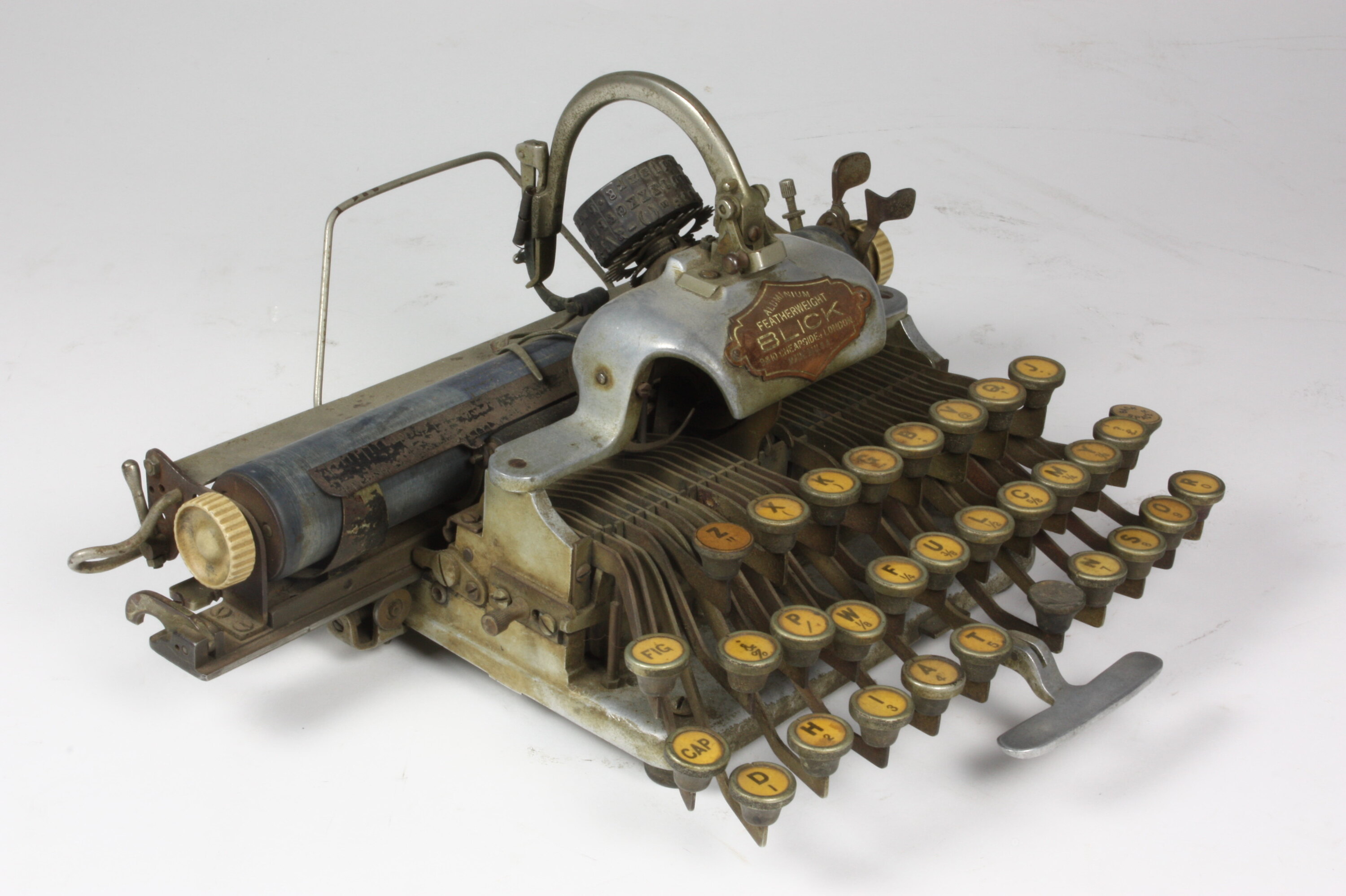 On plate attached to front of type-wheel mechanism cover: 'ALUMINIUM / FEATHERWEIGHT / BLICK / 9 & 10 CHEAPSIDE, LONDON / MADE IN U.S.A.' Serial number engraved on upper surface of right rear frame: '175979'