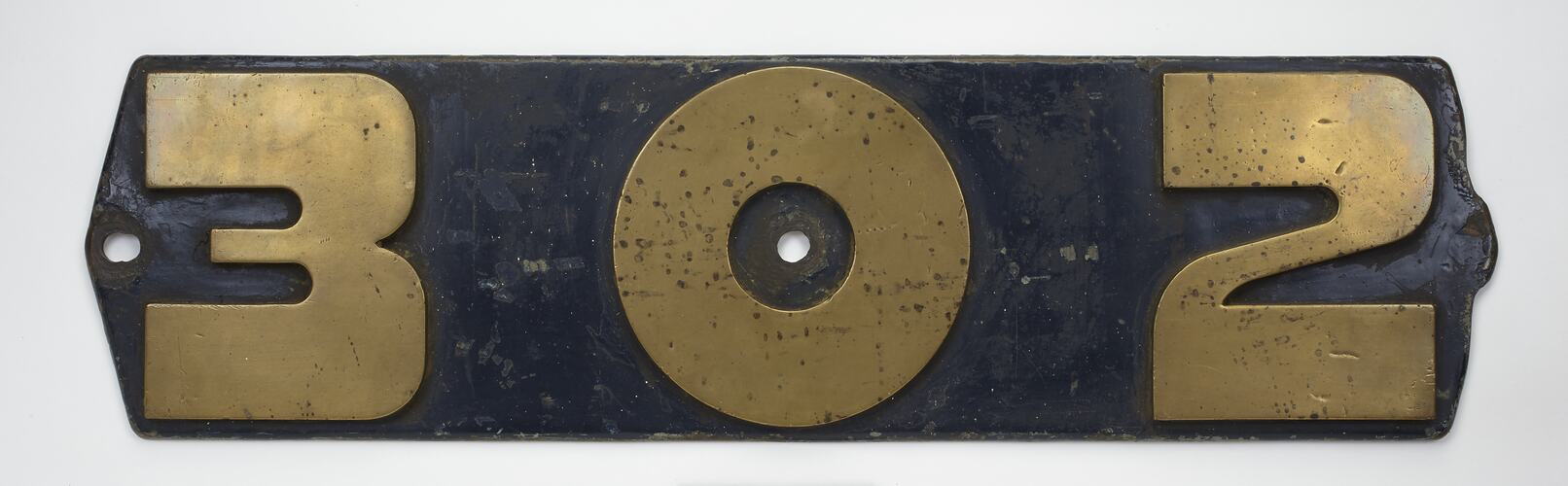 '302'. Ex Victorian railways S Class locomotive, S 302, "Edward Henty". Brass, with blue painted background and polished brass numbers. This locomotive was used to haul express passenger trains on the broad gauge section of the Melbourne-Sydney line between Melbourne and Albury/Wodonga. S 302 was originally built at Newport railway workshops in 1929, however this plate was fitted in 1937 when the locomotive was streamlined and given a new livery for the famous "Spirit of Progress" express. S 302 was broken up for scrap in 1954. The blue background is believed to be original paintwork and thus represents one of three of the only authentic surviving records of the "Spirit of Progress" livery.