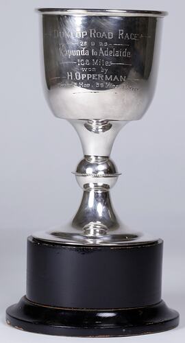 This cup trophy was awarded to Hubert Opperman for winning the Dunlop Road Race from Kapunda to Adelaide, South Australia on the 25th September 1926, in a time of 5 hours, 36 minutes and 13 seconds. This was the 11th edition of the race, considered the premier cycling event for South Australia, and sponsored by the Dunlop Rubber Company. It was run over a 106 mile (170.6 km) course that made its way over ironstone, pipeclay and finally a bitumen road after Gawler, the final 25 miles of the race. The road conditions were terrible due to the rain which had been falling since the previous evening and the 42 entrants began in conditions described as "cold, wet and cheerless".