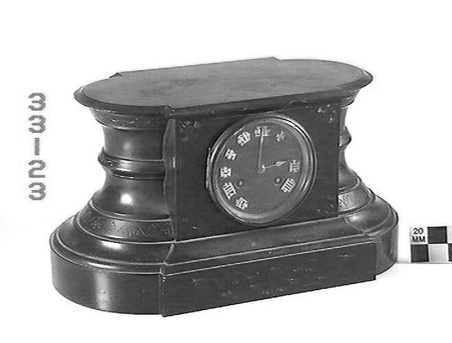 Black marble case with faded gold inlay. Black dial has ivory roman numerals, three of which are missing. Gold coloured metal hands. Spring wound; pin pallet escapement.