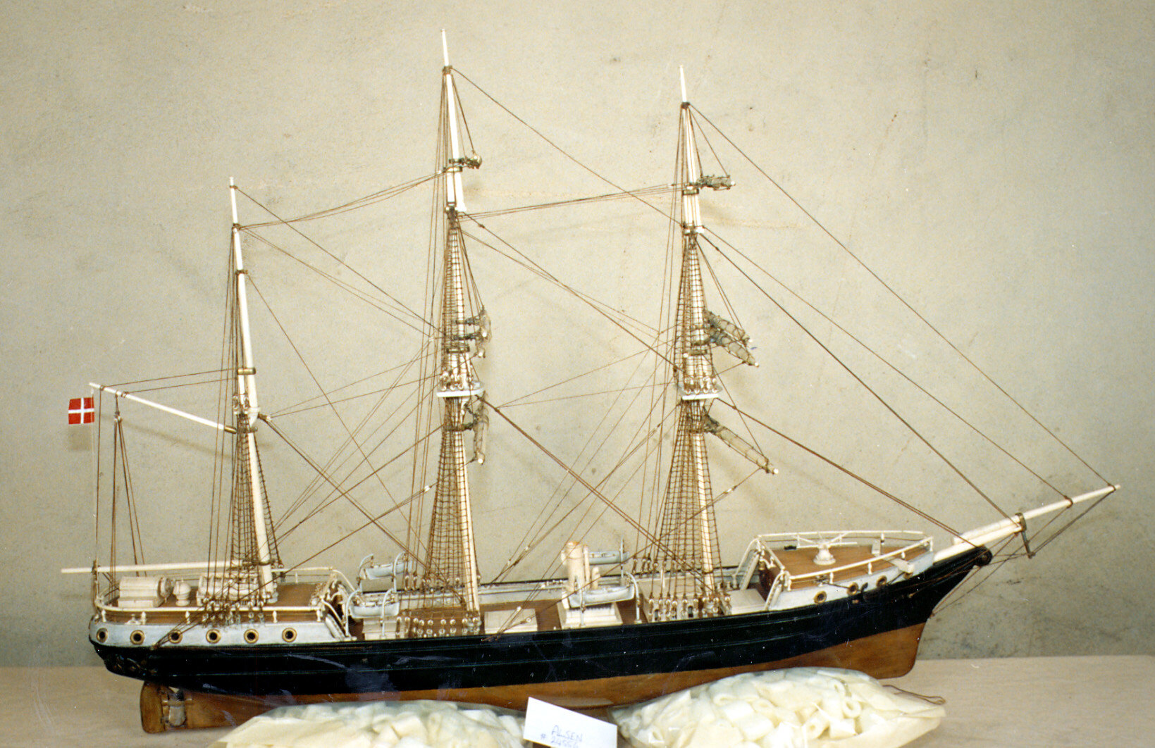 Model of the circa 1900 Danish auxiliary barque 'Alsen'. Masts, spars and small fitting are made of bone and ivory.