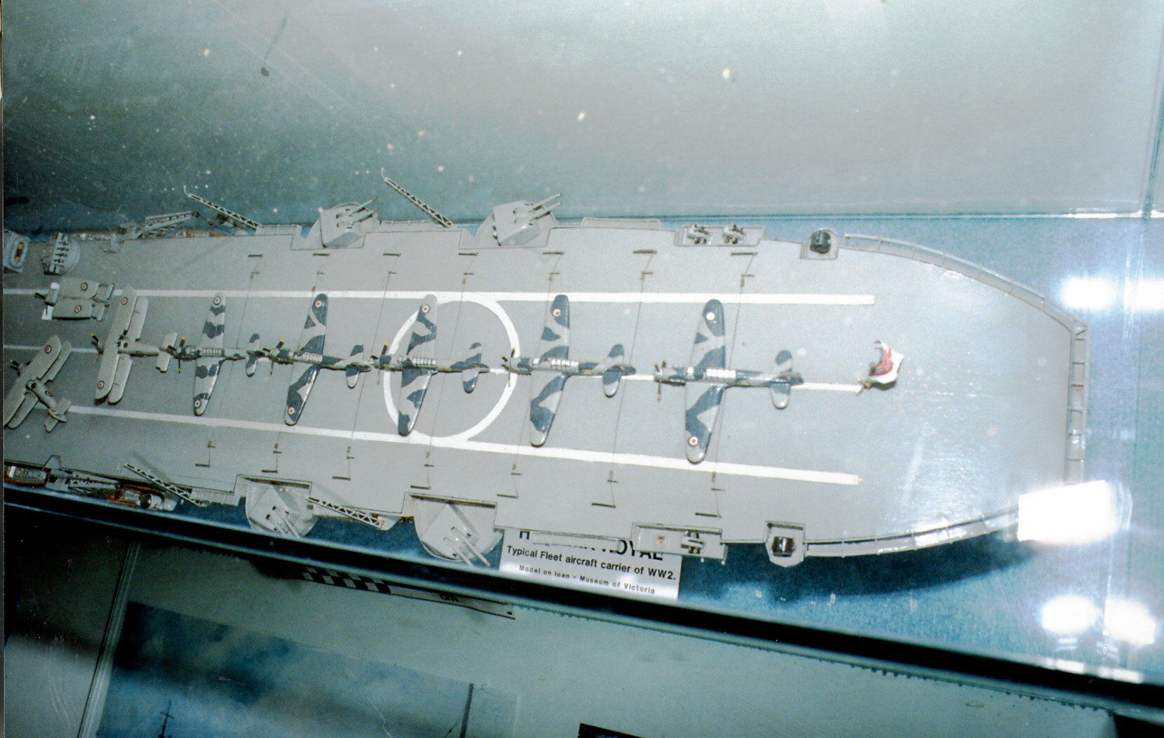 This 1:168 scale model of the aircraft carrier HMS Ark Royal was purchased from the modelmaker MR S.N. Rea by the Museum in 1945. Model Fairey Swordfish and Fairey Fulmar aircraft of the Fleet Air Arm are positioned on the deck.