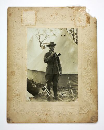 Photograph of Trumpeter A. L. B. Hampton outside a bell tent holding a bugle and carrying a trumpet, wearing leggings, boots and spurs. Biographical details are hand-written on back.