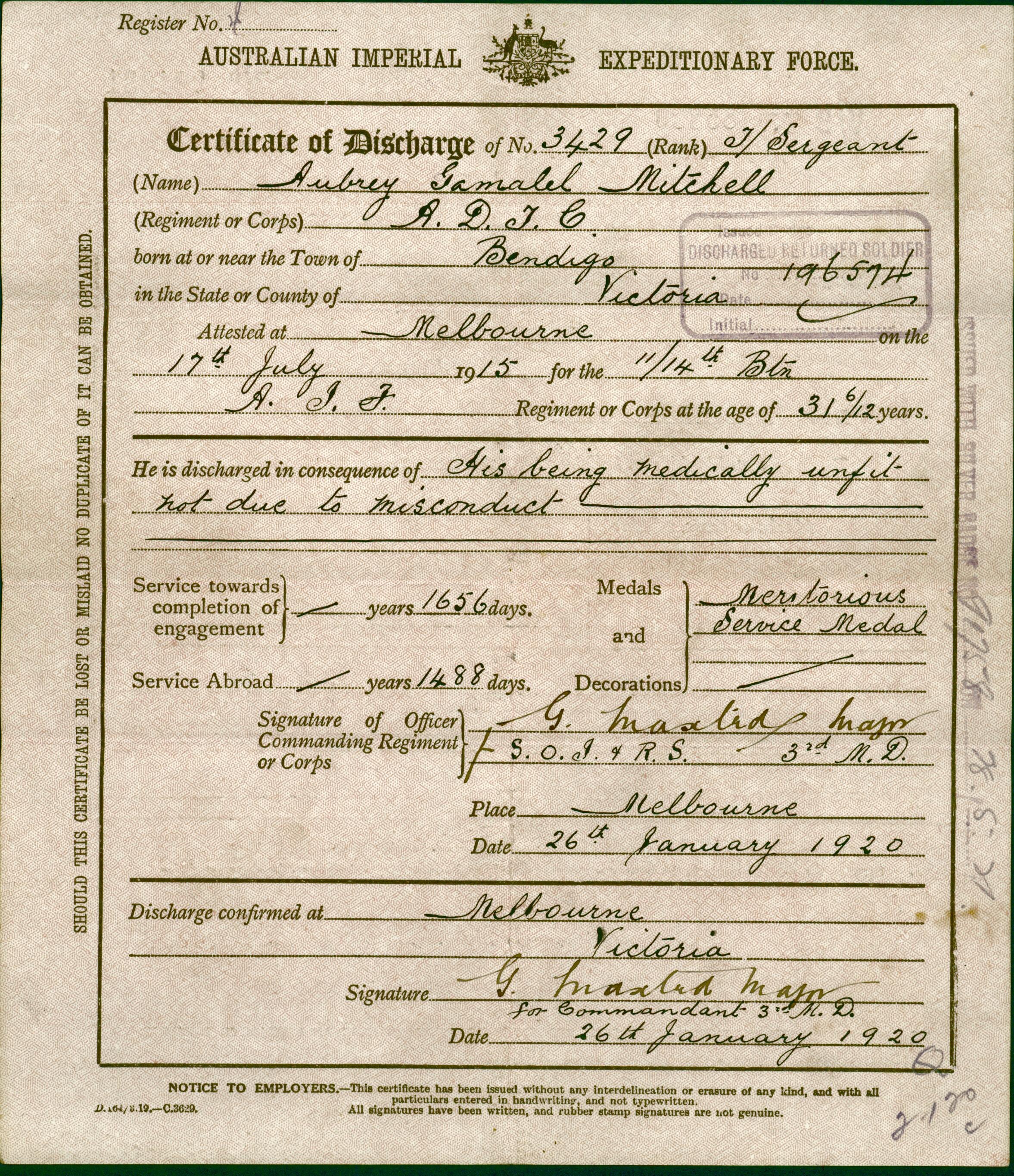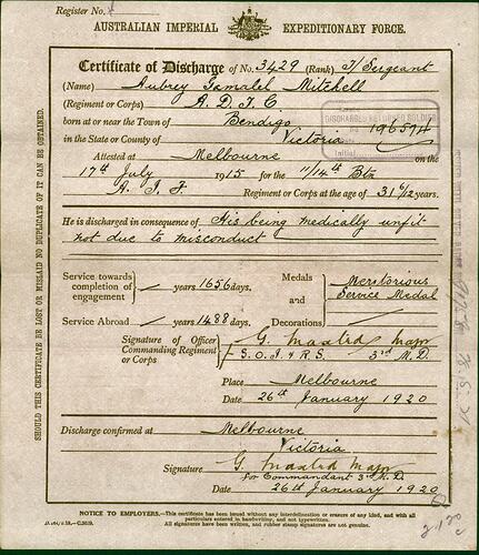Certificate of Discharge issued to Sergeant (named here as Temporary Sergeant) Aubrey Gamalel Mitchell, 26 January 1920. The certificate records his date of enlistment as 17 July 1915 and reason for discharge being medically unfit. Mitchell served for 1656 days including 1488 days service abroad. The certificate shows Mitchell received the Meritorious Service Medal.