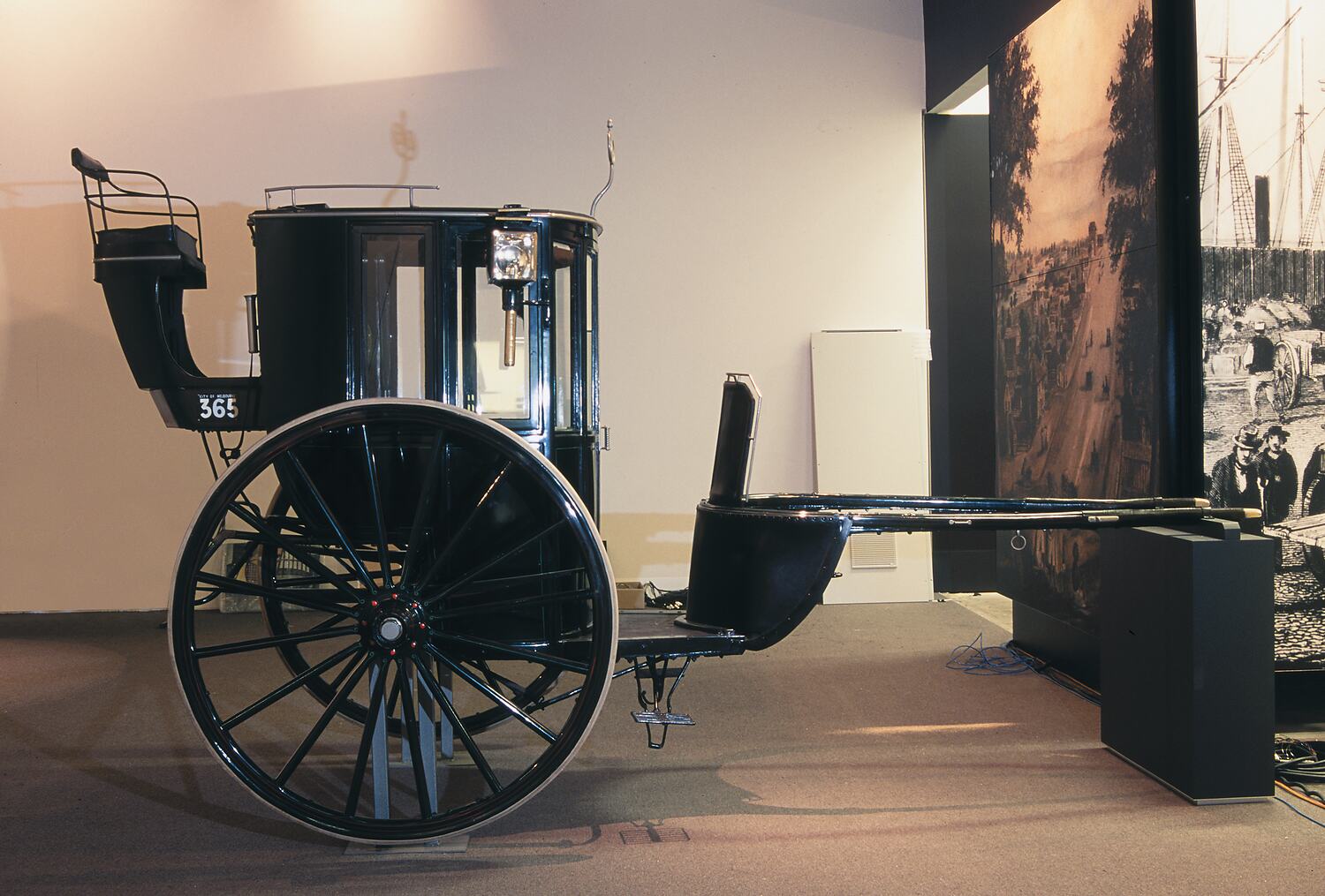 Two passenger hansom cab designed to be drawn by one horse, manufactured by Simmons & Sons, Coachbuilders, South Yarra, 1880s. Hansom cabs first appeared on Melbourne streets in the 1880s. They were built by local coachbuilders working from English designs. The driver, seated behind, could control the opening and closing of the doors, preventing passengers from running off without paying their fares.