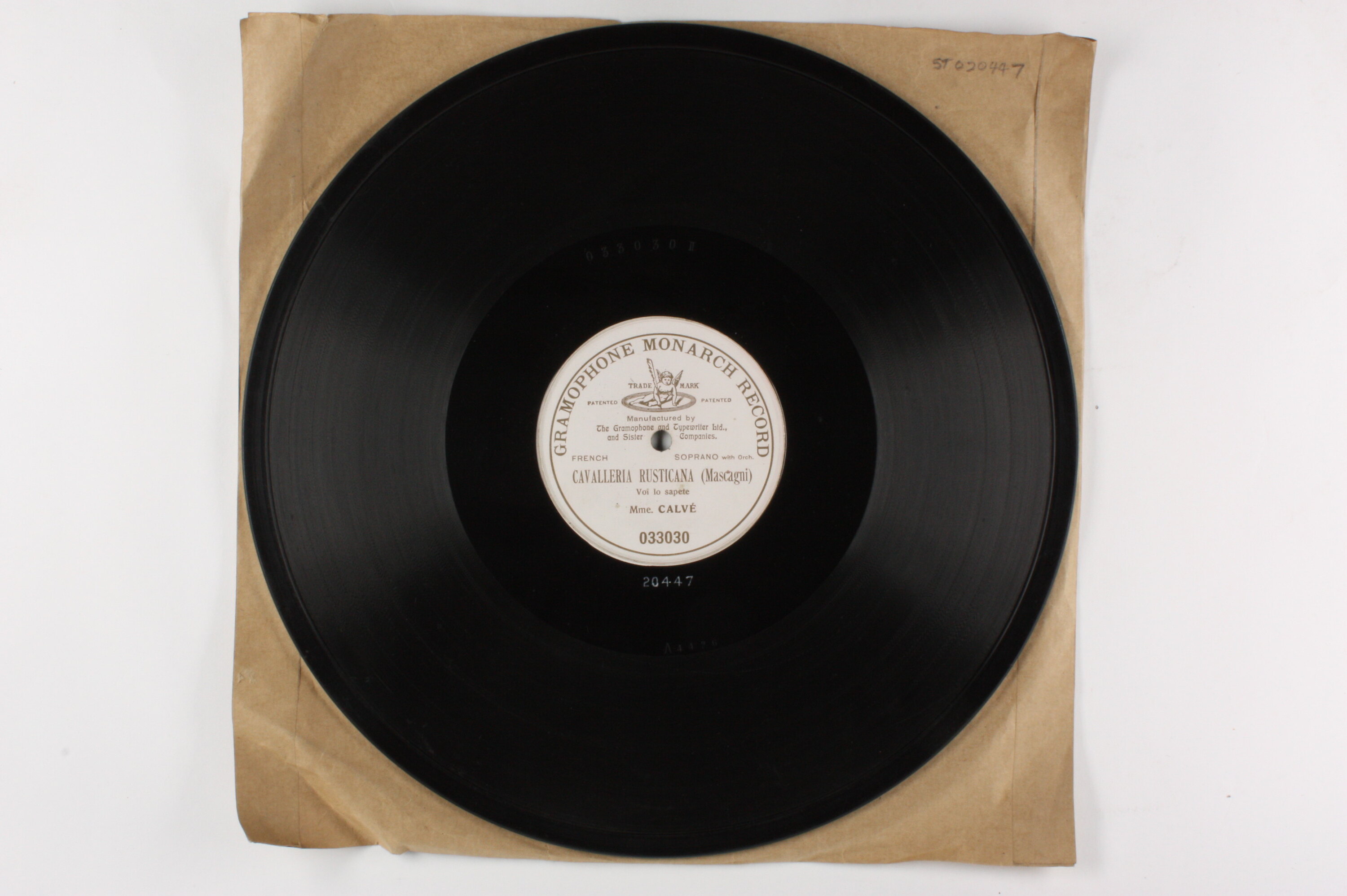 TYPE: GRAMOPHONE MONARCH 12 IN. CONTENTS: "CAVALLERIA AUSTRICANA" (MASCAGNI), SUNG BY MADAME CALVE, SOPRANO. COMPANY: GRAMOPHONE & TYPEWRITER LTD. & SISTER COMPANIES. TYPE DETAILS: PINK LABEL. COMMENTS: CAT. NO. 033030 CARD SAYS "THE FRENCH NUMBER ( 033030) OF THIS DISC IS WRONG, WHILE THE CORRECT NUMBER IS THE ITALIAN (053183).