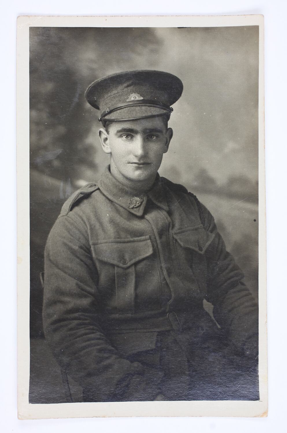 Photograph of Private Ernest 'Ernie' Briggs, C Company, 27 Battalion, 10 Infantry Brigade, A.I.F. Taken at Bulford Camp on Salisbury Plain, during World War I. The photo is endorsed 'on active service', and was probably sent from France.