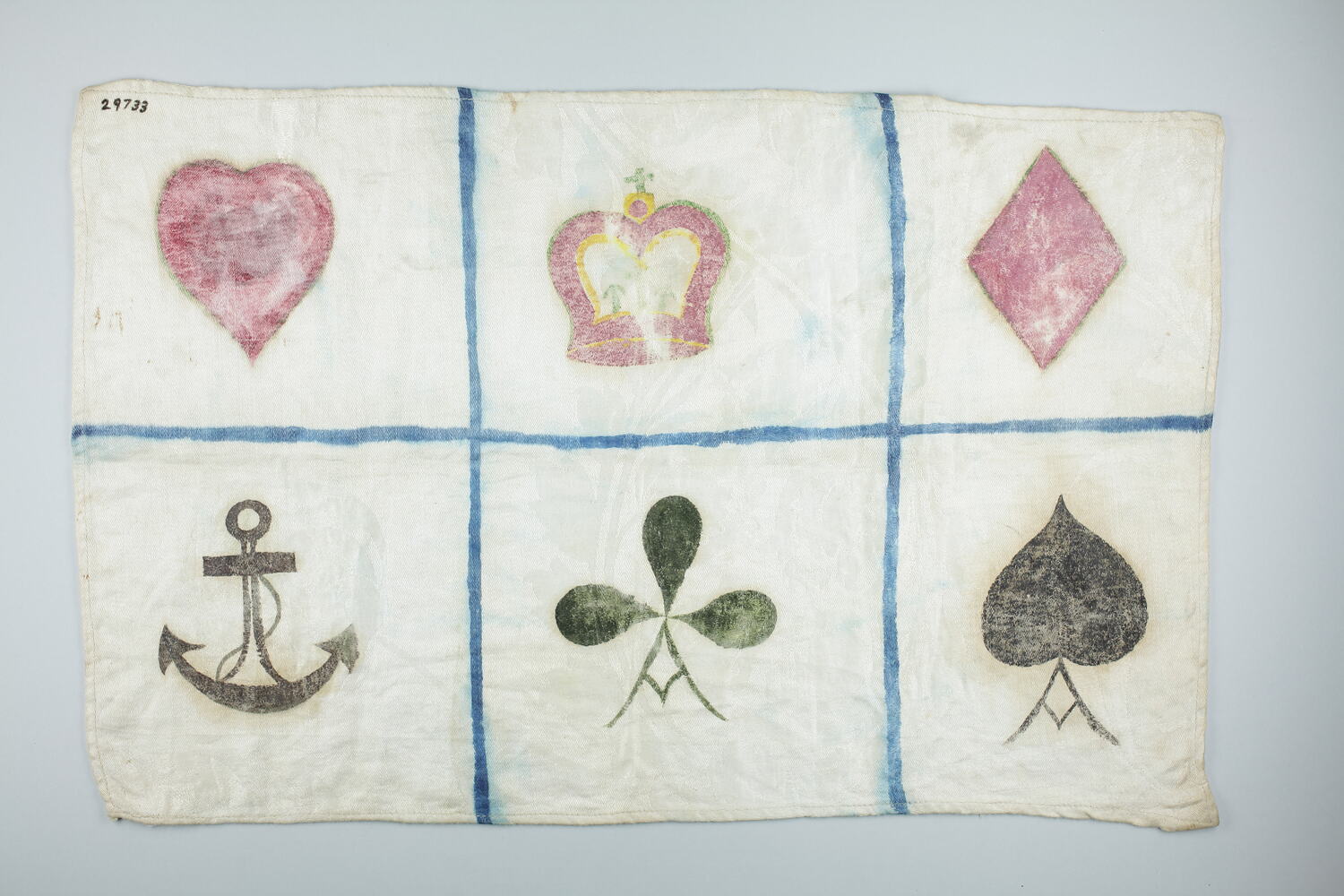 Game consisting of three dice, one leather kip and one patterned cloth. The three ivory dice have symbols of a crown, anchor, diamond, heart, club and spade on the six faces. Each dice is a cube with side 13mm in length. The kip is cylindrical and made from stiff leather, decorated, with the seams at the side and base hand-sewn. It is 450mm. in diameter and 750mm long. The game mat is a white rectangular cloth, divided into six squares by blue lines, each square containing one of the symbols appearing on the dice.