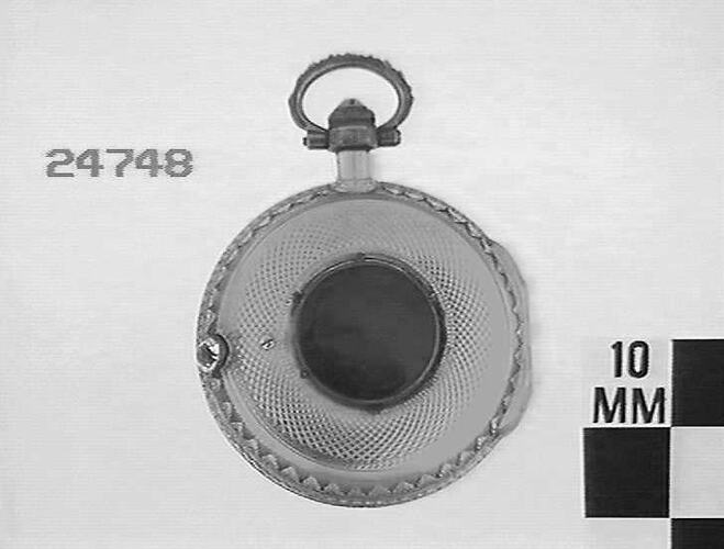 Gold case has ornate bezel set with stones. White enamel dial has roman numerals and is marked 'London'". Back surface is engine turned and has blue enamel circle. Pump action wound spring; lever escapement. Fusee and chain. The pump action of the pendant button winds the striking. Strikes on case. To open movement the pendant button must be raised.