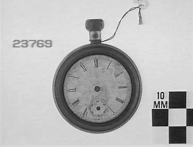 Nickel plated case, open face. Paper dial has roman numerals and seconds dial at 6. Has paper in back with guarantee. Key wound spring; pin pallet escapement.