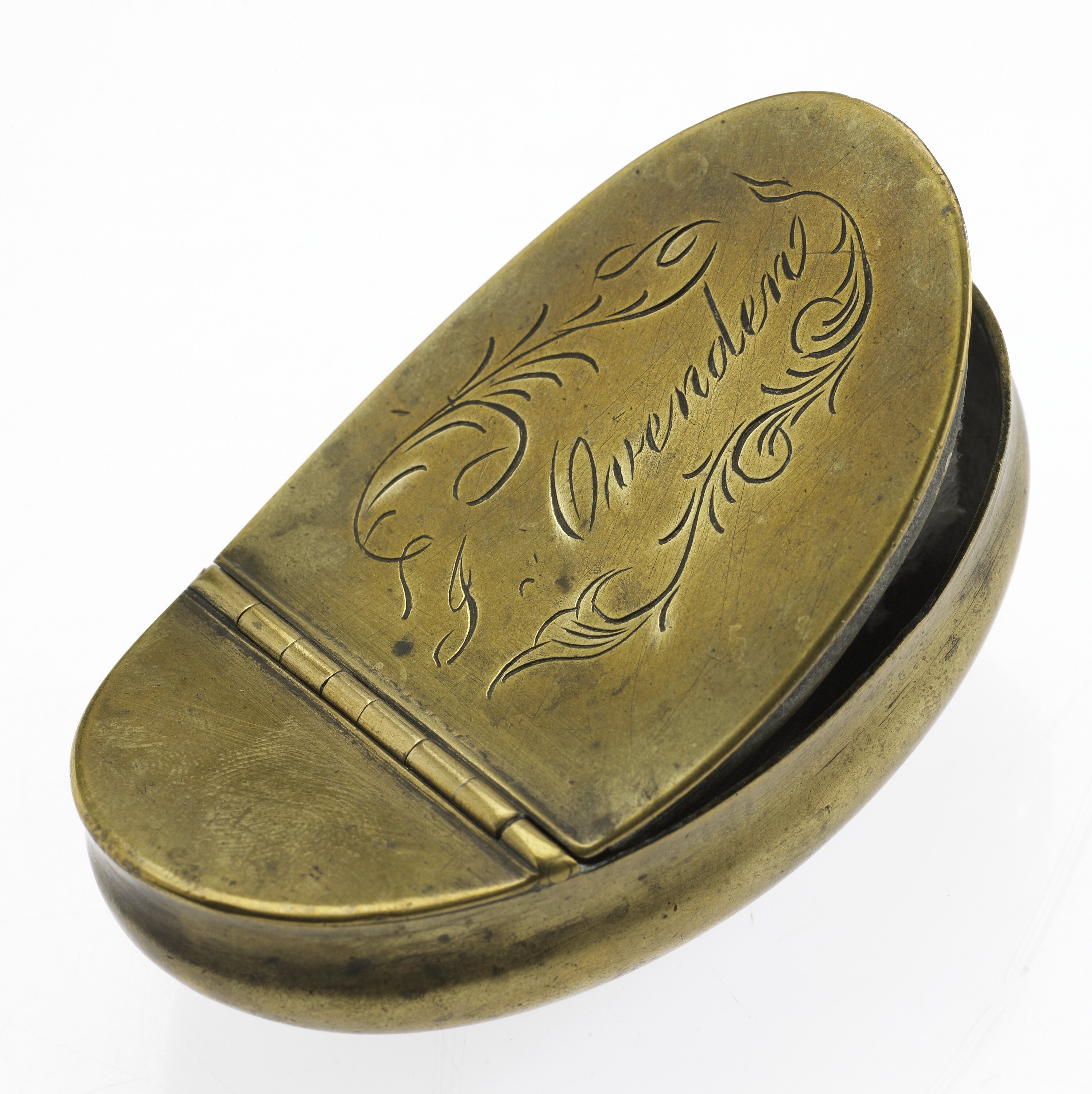 Semi-ovoid shaped brass snuff-box engraved with the name "J. Ovenden".