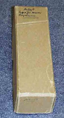 Brown cardboard box used to store paper tapes in CSIRAC paper tape library. Box lid is labelled with ink on lid "Hobart Tapes for Drum Programme". Side of box lid is labelled with ink "Hobart".