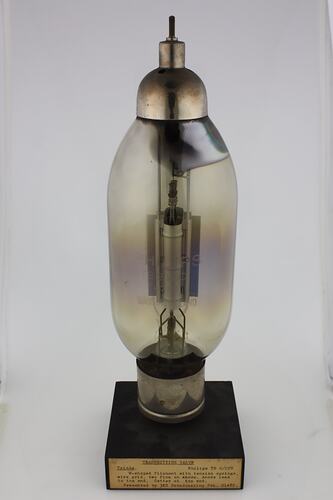 Cylindrical bulb with tapered ends. Plated metal base with one flat and two round pins. Plated top cap with threaded terminal with nut missing. Mounted on display block.