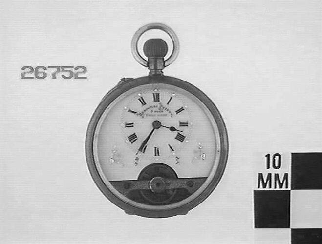 White enamel dial is cut away below 6 to reveal balance wheel. Dial has roman numerals. Stem and button wound spring; lever escapement.