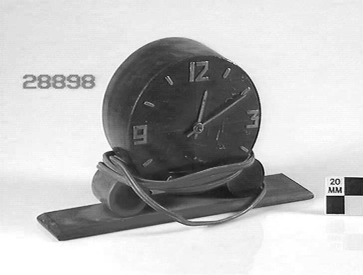 Mantle clock with a round wooden case mounted on a flat board supported by two horizontal cylinders of wood. Dial has no glass. Dial has metal numbers mounted on a wooden face divided into four quarters. Electric synchronous movement.