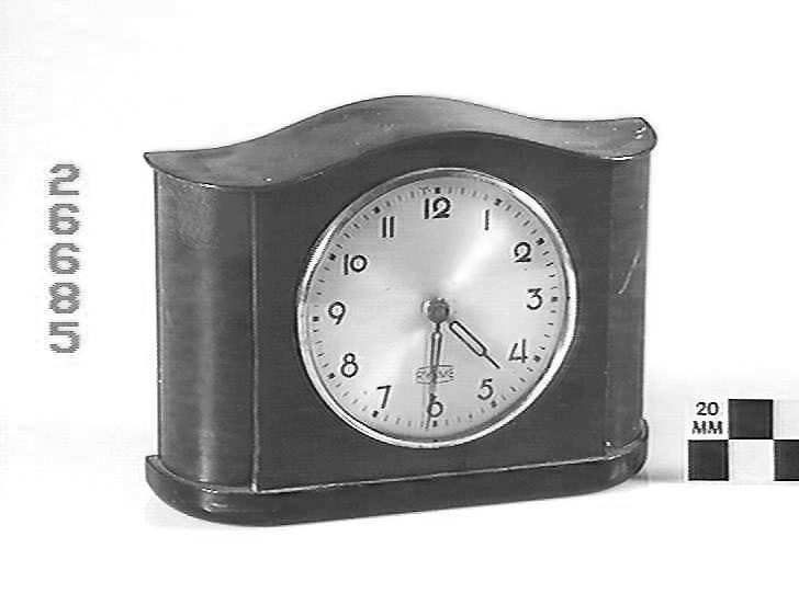 Wooden veneered case with arched top and black base. Round silvered dial with chrome bezel, blacks hands, and arabic numerals. Electric synchronous movement.