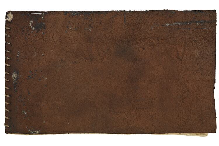 Paper notebook with leather covers spiral bound at top. Water-damanged, with extensive mould.