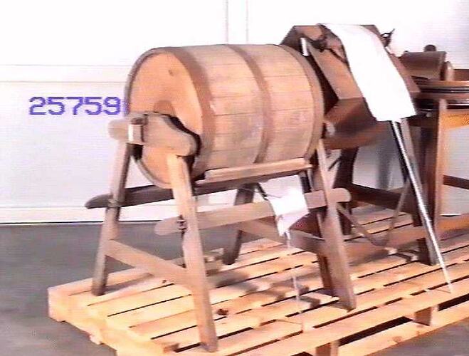 Tumble action barrel-type butter churn mounted in a wooden frame with four legs. Hand-operated. Barrel is 610 mm long and 533 mm in diameter. Removable panel to allow filling and inspection.