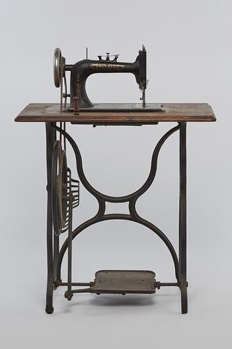 'Standard' Lock-Stitch treadle-operated sewing machine, made by Standard Shuttle Sewing Machine Co., New York, USA, circa 1882. Fitted to a metal frame with a wooden bench and cover; black enamel with gold scroll. Marked '372539'.
