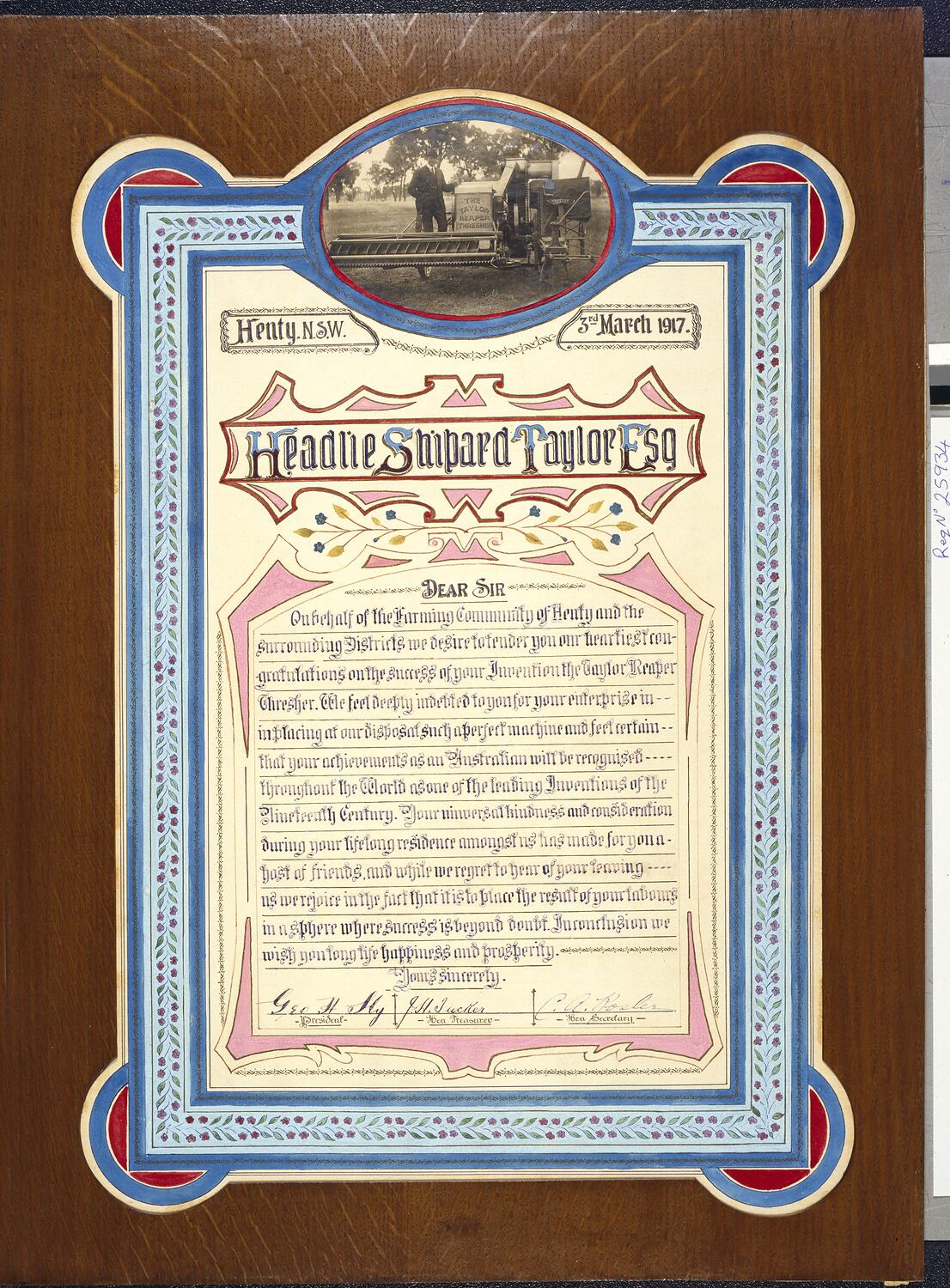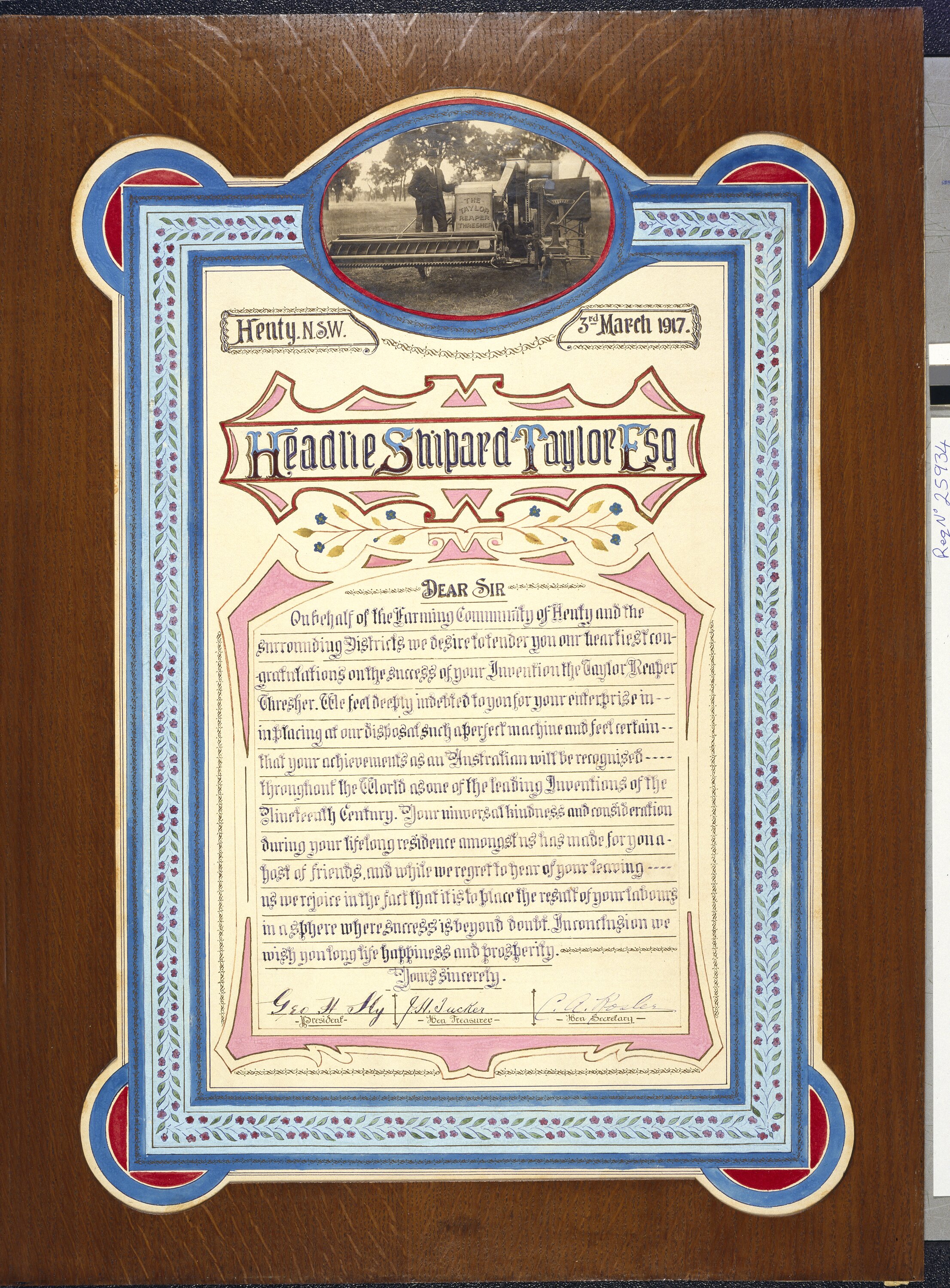 Framed testimonial presented to Headlie Shipard Taylor by residents of the Henty District of New South Wales on 3 March 1917, upon his departure from the district to take up a role at H.V. McKay's Sunshine Harvester Works. The testimonial congratulates Headlie on his invention of the 'Reaper Thresher' (also known as the Taylor Header Harvester).