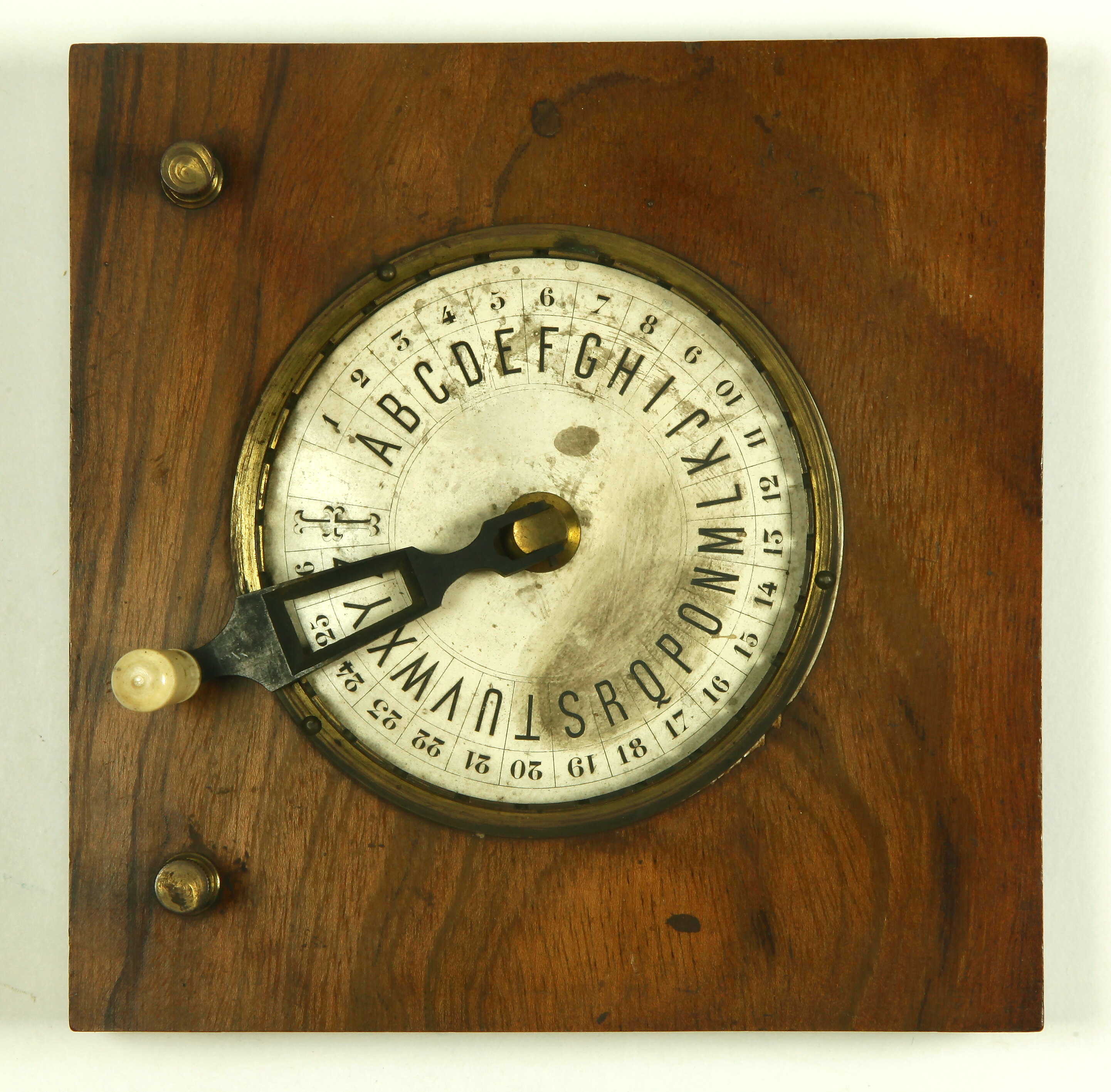 Wooden baseboard. Horizontal circular dial with outer ring of numbers and inner ring of letters displayed around its periphery. Dial surrounded by brass ring with a notch opposite each letter. Arm pivoted in the centre of the dial moves round notched ring and can be positioned at each notch. Pivot at the centre of the dial carries a toothed wheel beneath wooden baseboard. As wheel turns each tooth makes contact in turn with a brass strip, completing the circuit between the two brass screw terminals mounted above the baseboard.