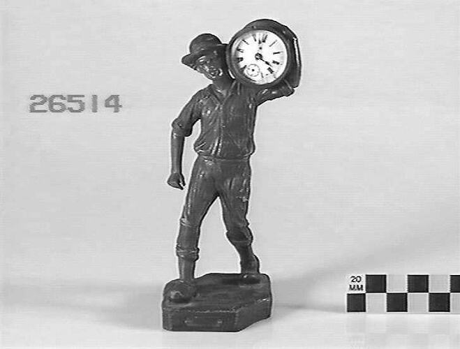 Mantel clock; small cylindrical clock mounted on a man's shoulder. Made by Ansonia Clock Co, New York, circa 1910.