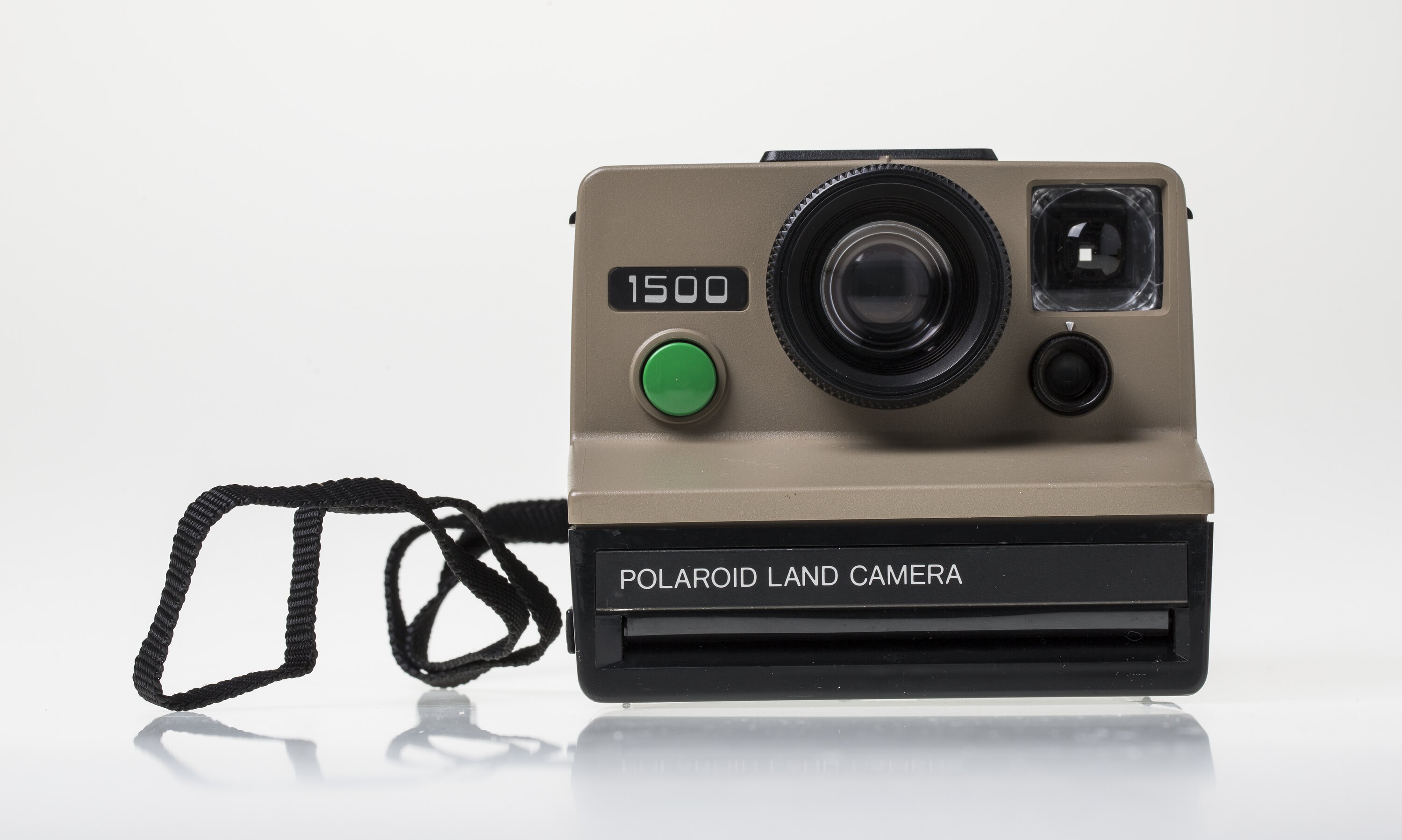 The Land Camera 1500 is a foreign market version of the original 'Onestep' model. Features single element fixed focus plastic lens103mm f/14.6, four foot minimum focus distance, electric eye function with manual light/dark control dial, electronic shutter and neck strap attachment. Uses SX-70 type instant film, which was first released in 1972 and had a sensitivity of around ISO 160.