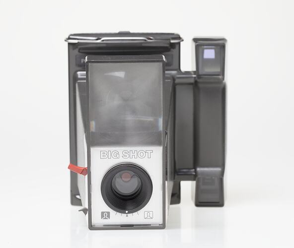 One of the largest cameras produced by Polaroid, it is well known for its distinctive shape and unusual features; namely its fixed focus which requires the user to move in and out to establish the correct focus, sometimes referred to as the 'Big Shot shuffle'. The camera is designed to only take portrait photographs and best results are generally achieved when the flash is used. The 'Big Shot' uses a 220mm lens, requires ASA 75-100 Pack films and has a single speed shutter.