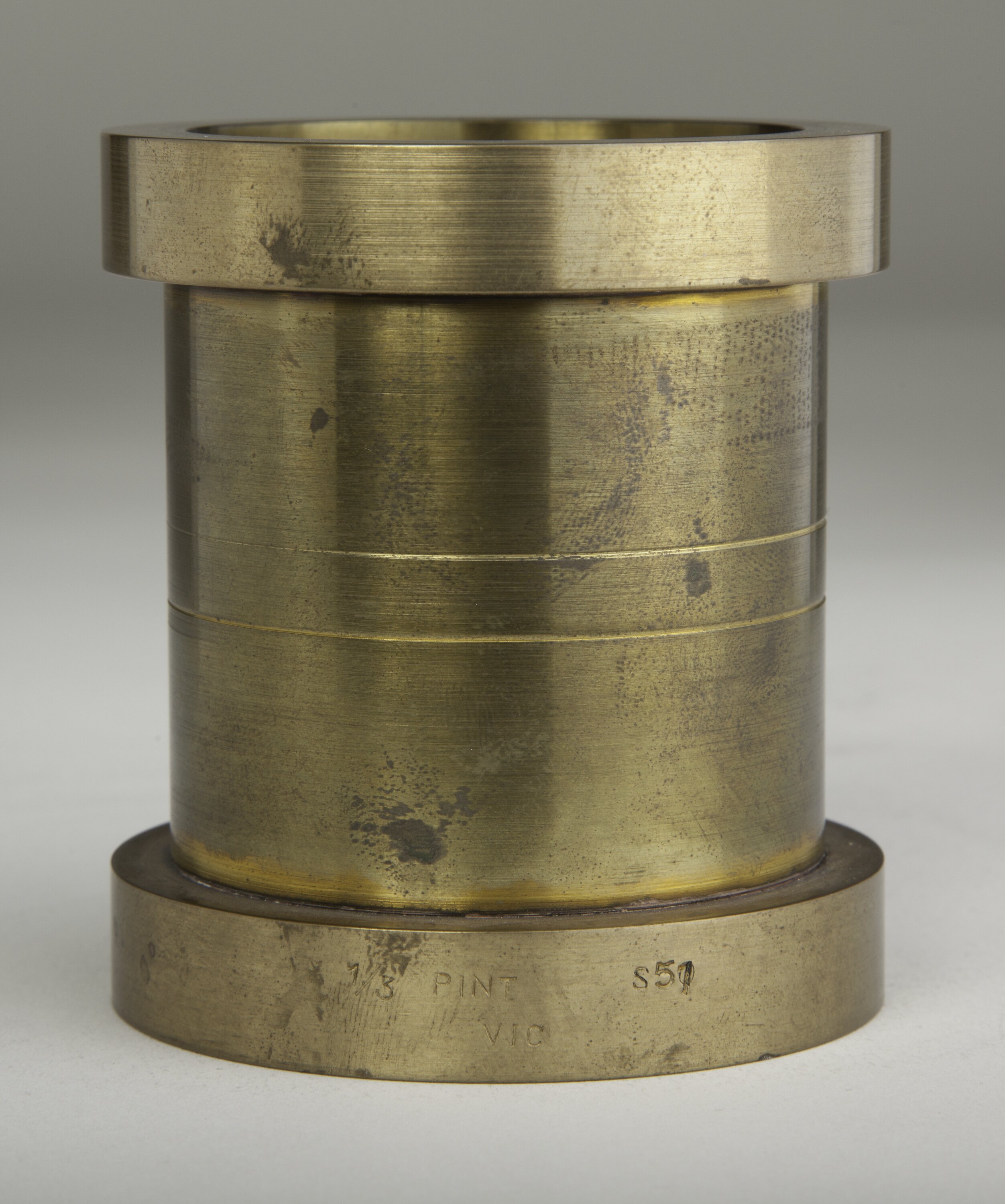 Standard one third pint, brass. Used at Melbourne Observatory as part of its responsibility for administering weights and measures for Victoria. Subsequently used by the Weights and Measures Branch when the Observatory closed in 1944.