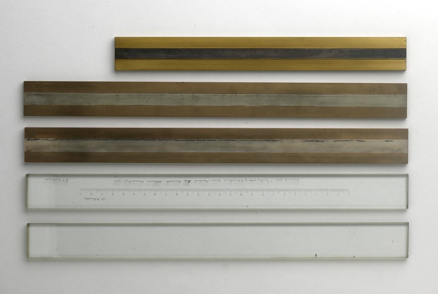1. 20 centimetres by 1 millimetre, silver strip on brass, marked "MELBOURNE OBSERVATORY, NO. 1 MILLIMETRE" 2. 18 centimtres by 1 millimetre, silver strip on brass, marked "MELBOURNE OBSERVATORY, NO. 2 MILLIMETRE". 3. 25 centimetres by 1 millimetre, silver strip on brass. 4. 18 centimetres by 1 millimetre, glass. 5. 25 centimetres by 1 millimetre, glass, marked "ENGRAVED FROM P. GAUTIER'S COPY OF INTERNATIONAL BUREAU STANDARD, SLIDE MICROMETER, MELBOURNE OBSERVATORY, 1892, W. P. WILKINSON".