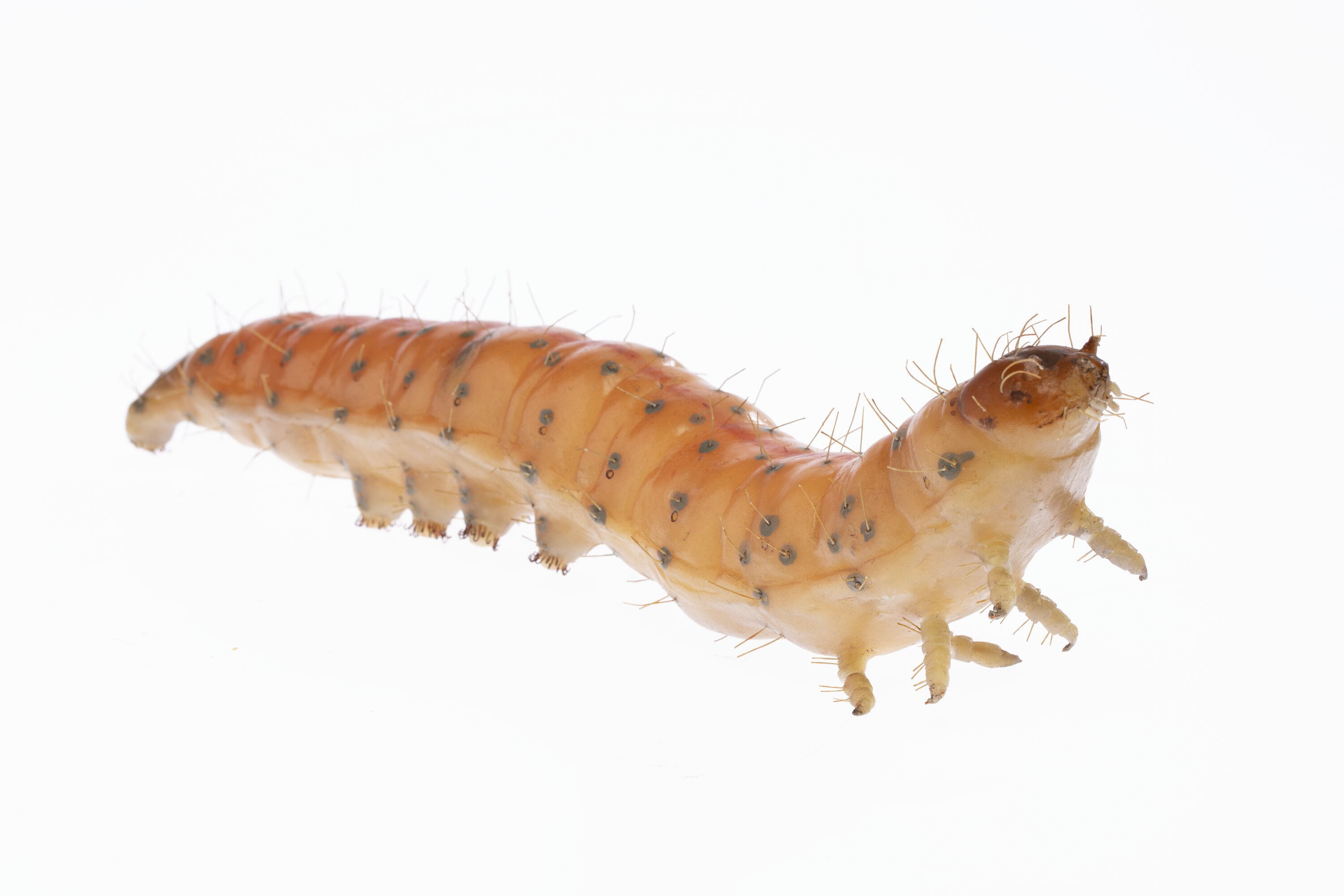 Red and white model of a larva or caterpillar. The model has a long, sectioned body, sixteen legs and small black eye stalks. The body of the insect is spotted and covered in hair.