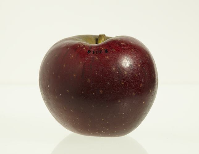 Wax model of an apple with a short stem, painted dark red. The apple has grey spots and grey-brown scruff at the top.